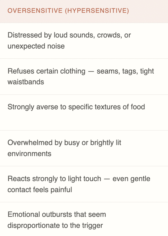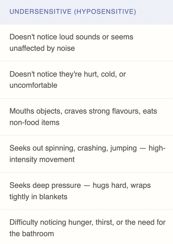 Specific flavours, textures of food, temperatures. “Picky eating” is often rooted in sensory sensitivity, not preference or stubbornness.